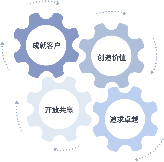 成就客户是一切决策的出发点,,,,创造价值是衡量所有工作的标准,,追求卓越是我们做事做人的态度,,,,开放共赢是我们的格局也是最终的结果。。价值观的齿轮环环相扣,,,推动着组织里的每个人不断向前。。。。
