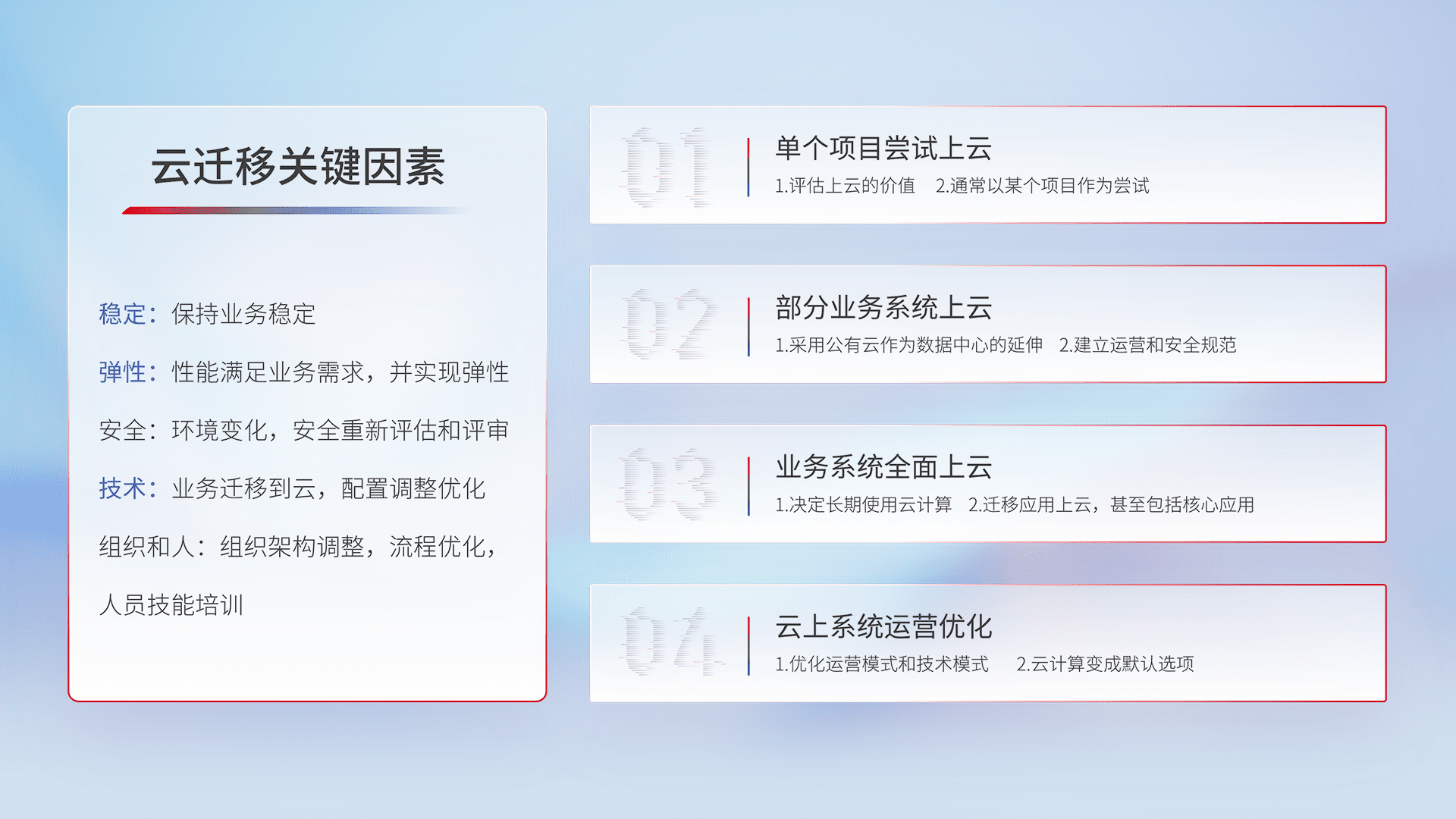 结合实际业务,,,从规划设计、、、、云平台选型、、、、云原生改造、、数据迁移、、集成交付,,,迁移全过程为客户识别最佳上云路径,,做好风险识别管理,,,设计网络架构、、、身份权限、、、、安全审计合规、、、操作审计、、、日志审计、、、监控告警策略、、、多站点容灾设计等,,,对云上基础设施进行整体规划,,,提升IT治理水平,,,,以满足弹性、、、、高可用、、、高性能的需求。。。